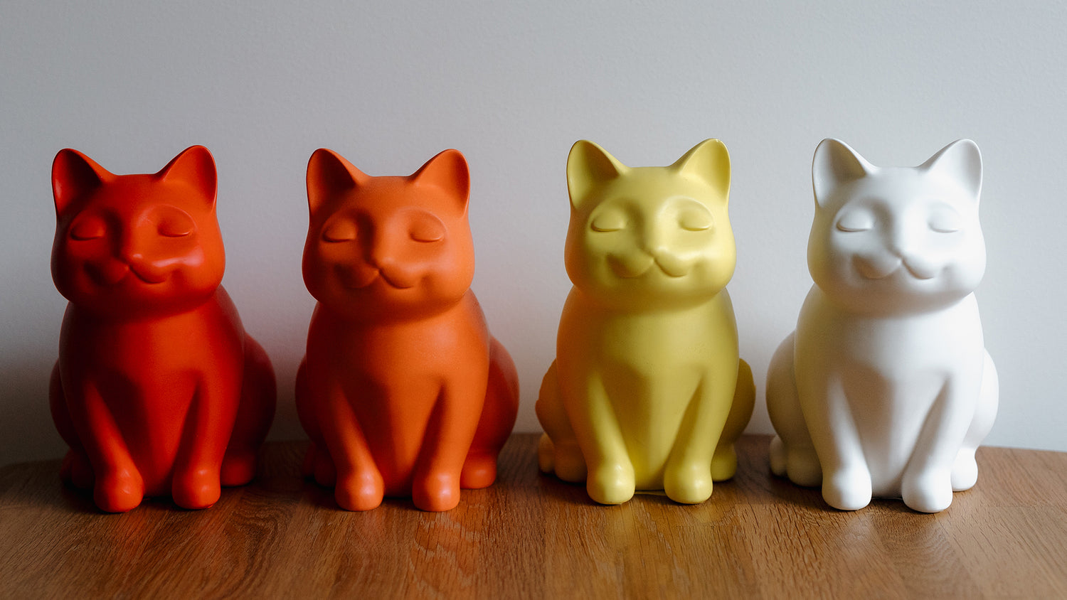 • Four colorful cat-shaped cremation urns on a wooden surface with a neutral background. Features personalized cat urns for ashes, custom cat cremation urns, cat-shaped urns, sleeping cat statue urns, and pet urns for cats with engravable and personalized options.